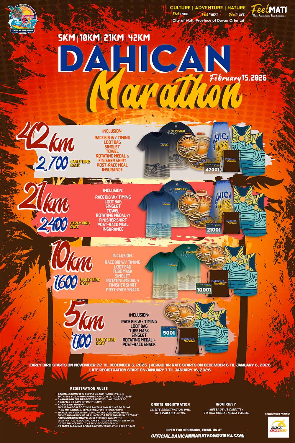 Visit websiteThe Dahican Marathon 2026 color theme draws inspiration from the warm orange hues of sunrises over Mayo and Pujada Bays in the beautiful City of Mati.